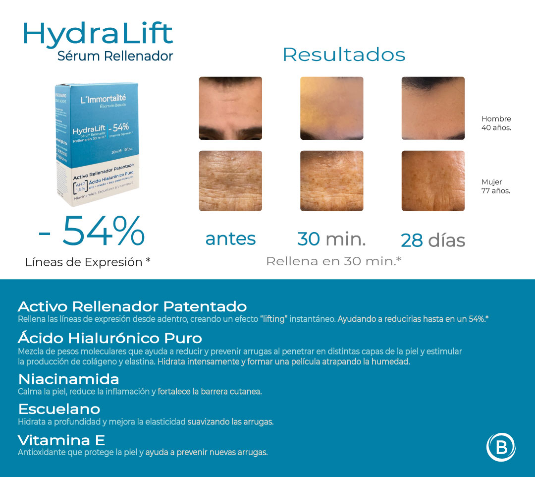 Este no es un producto para cambiar quién eres, sino para reconectar con tu fortaleza esencial. Hydralift restaura el soporte estructural de la piel, disminuyendo la apariencia de las líneas de expresión al devolverle su plenitud original. Es la dignidad de un rostro que no niega su historia, solo la presenta en su versión más firme.